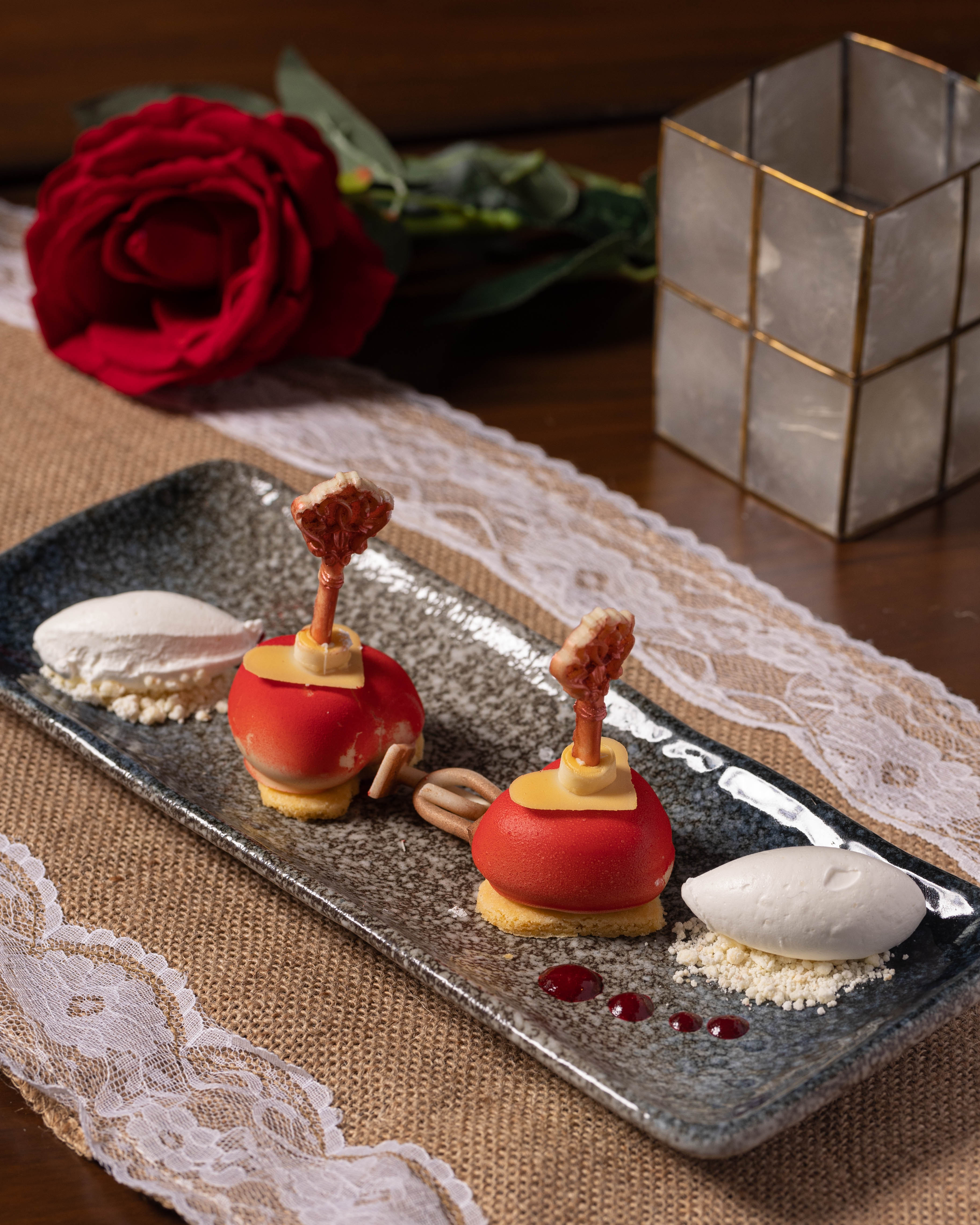 夕べは終わりを迎える ヒマガス, a マニラの心臓 ラズベリーとローズの創作デザート。ムース、ウベ、アーモンド、ブルターニュ風ショートブレッドを組み合わせました。分かち合うためにデザインされたこのデザートは、静かな甘さが長く続く。まるで愛が時を経て、永遠のものへと落ち着いていくように。